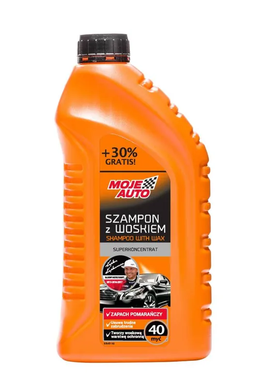 Opis produktu i zastosowanieSzampon samochodowy z woskiem Moje Auto to szampon, który efektywnie zmywa najtrudniejsze zabrudzenia i osady oraz nabłyszcza karoserię. Usuwa uporczywe zabrudzenia – błoto, sól drogowa, ślady po insektach, soki z drzew, smoła i zabrudzenia wynikające z codziennego użytkowania.Tworzy woskową warstwę ochronną, która zabezpiecza karoserię przed wpływem czynników zewnętrznych. Szampon samochodowy z woskiem to produkt przeznaczony do regularnego stosowania. Niezwykle wydajny superkoncentrat, który wystarcza do 40 myć. Szampon rozcieńczamy z wodą w proporcji 100 ml koncentratu na 10 l wody.Szampon samochodowy z woskiem Moje Auto oddziałuje na lakier dwukierunkowo – usuwa zabrudzenia i zabezpiecza przed korozją. Stałe mycie pozwala na zachowanie pierwotnego blasku lakieru samochodu. Jest biodegradowalny, łatwo ulega procesowi rozkładu, nie stwarza zagrożenia dla środowiska. Ma przyjemny, zapach pomarańczy.