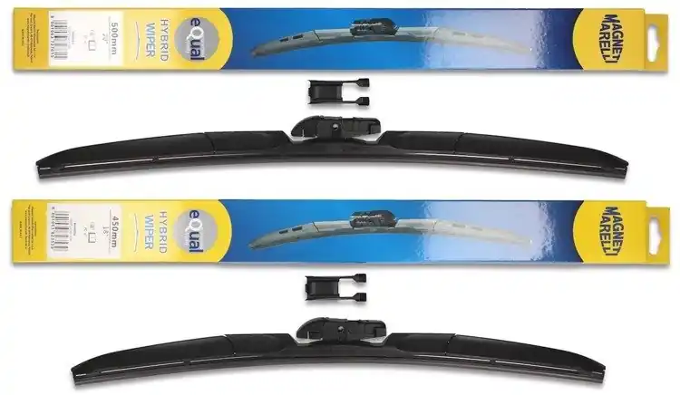 Nowe wycieraczki; zapakowane w oryginalne opakowanie producenta. Cena zakupu dotyczy 1kompletu (strona kierowcy i pasażera).  Wycieraczki hybrydowe Magneti Marelli to wyjątkowa konstrukcja i najwyższa jakość materiałów:- Guma – ponad 50% kauczuku naturalnego z grafitową powłoką; wewnątrz gumy podwójna stal nierdzewna.- Złącze – materiał POM (tworzywo termoplastyczne o wysokiej wytrzymałości mechanicznej i odporne na ciepło)- Spojler – materiał ABSWycieraczki montuje się bardzo szybko i sprawnie; obrazkowa instrukcja montażu znajduje się na ich opakowaniu.Zalety wycieraczek hybrydowych Magneti Marelli1.Jeden uniwersalny adapter w wycieraczkach hybrydowych Magneti Marelli znajduje zastosowanie w czterech różnych ramionach wycieraczek, co sprawia, że pasują do większości modeli samochodów.2. Sztywne gumowe pióro z grafitową powłoką w wycieraczce hybrydowej Magneti Marelli zapewnia bardziej skuteczne wycieranie powierzchni szyby.3. Wycieraczki hybrydowe Magneti Marelli dzięki zaawansowanej technologii, mogą zastąpić dotychczasowe tradycyjne wycieraczki w starszych modelach samochodów, a ich wymiana jest szybka i łatwa.4. Wycieraczki hybrydowe Magneti Marelli są odporne na niekorzystne warunki atmosferyczne ; zakres temperatury, w których ich praca odbywa się bez zakłóceń to -25ºC do +50ºC.5. Jakość materiałów użytych do produkcji wycieraczek hybrydowych Magneti Marelli zapewnia ich wytrzymałość oraz cichą pracę.6. Nowoczesny design zastosowany w wycieraczkach hybrydowych Magneti Marelli sprawia, że to jedne z bardziej poszukiwanych wycieraczek na świecie.  Jak dbać o wycieraczki:- pamiętaj, aby dbać o gumę wycieraczki usuwając z niej brud, owady itp., które osiadły podczas jej pracy (wykorzystać można do tego łagodny detergent); zapominanie o usuwaniu zanieczyszczeń, może doprowadzić do uszkodzenia gumy wycieraczki- nigdy nie używaj wycieraczek, gdy szyba jest sucha;  tarcie gumy po suchej szybie może doprowadzić do szybkiego jej zużycia- jeżeli wycieraczka na szybie podskakuje, może to być oznaką, że ramię wycieraczki jest skrzywione; w takim przypadku należy dokonać jego regulacji- jeżeli planujesz pozostawienie samochodu  na słońcu przez kilka dni, ustaw wycieraczki tak, aby nie stykały się z szybą- po wizycie na myjni, pamiętaj, aby zawsze dokładnie oczyścić szybę, ponieważ znajdujący się na niej wosk, może powodować przeskakiwanie wycieraczki- pamiętaj również, aby nie uruchamiać wycieraczek na zamarzniętej szybie; może to bowiem doprowadzić do ich uszkodzenia lub oderwania gumy od mocowania.