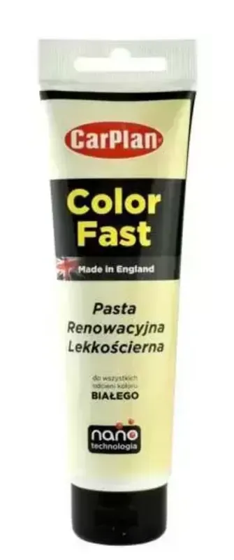 CARPLAN T-CUT NANO 150G NA RYSY KOLOR BIAŁY Innowacyjny produkt łączący wsobie technologię usuwania rys zastosowaną wprodukcie T-Cut Scratch Remover ztechnologią wydobywania głębi koloru użytą wrenomowanym produkcie T-Cut Color Fast. Pasta występuje w6 najbardziej popularnych kolorach : czerwonym, czarnym, białym isrebrnym. Właściwości : formuła pasty wykorzystuje nanotechnologię pozwalając łatwiej usuwać drobne rysy, zmatowienia iprzebarwienia orazmaskować większe ubytki kolorowe pigmenty zawarte wprodukcie współgrają zkażdym odcieniem białego koloru – czyszcząc iusuwając utlenione warstwy lakieru tworzą doskonałe, kolorystycznie dopasowane wykończenie Sposób użycia : niewielką ilość pasty nakładać na czyszczoną powierzchnię okrężnymi ruchami wcierać pastę do momentu zniknięcia rysy usunąć resztki środka zanim wyschnie Zalecenia producenta : przed zastosowaniem należy przetestować działanie pasty na małej powierzchni nie stosować preparatu jeżeli wierzchnia warstwa lakieru jest uszkodzona przy polerowaniu należy uważać aby niezetrzeć zbyt dużej warstwy lakieru unikać mocnego polerowania na krawędziach nie stosować na nowych, błyszczących powierzchniach aby nabłyszczyć karoserię zaleca się nałożenie woskuT-Cut Color Fast Opakowanie : tubka 150g