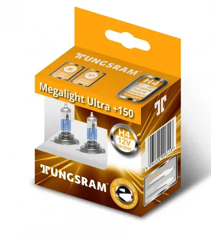Dzięki specjalnej konstrukcji żarnika izaawansowanej technologii, produkują ażdo 150% więcej światła niż konwencjonalne żarówki. Żarówki Megalight Ultra +150% wypełnione są w100% ksenonem. Srebrna pokrywa sprawi, że Twój samochód będzie się prezentował jeszcze bardziej stylowo. Seria Megalight Ultra +150% uzyskała homologację ECE pozwalającą na używanie żarówek na drogach publicznych. Badania dowodzą, że lepsze oświetlenie podnosi bezpieczeństwo ikomfort jazdy orazma pozytywny wpływ na zmniejszenie liczby wypadków. Zaleca się zawsze wymieniać obie żarówki jednocześnie. Specyfikacja: Średnica żarówki: 16,18mm Maksymalna długość całkowita: 87mm Podstawa: P43t Kategoria: H4 Życie (Tc): 250godz Nominalne natężenie światła lampy: 1650/1000lm Nominalna moc lampy: 60/55W Nominalny zakres napięcia lampy:12V Nominalne napięcie lampy:12V