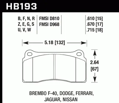 Klocki hamulcowe samochodoweHB193F.670 – HAWK Performance HPS(komplet na oś przednią i tylną)HAWK PERFORMANCE HPSKlocki hamulcowe High Performance Streetsą znane ze względu na zwiększanie siły hamowania w pojazdach dopuszczonych do ruchu ulicznego.Mieszanka High Performance Street oferuje wyższy współczynnik tarcianiż standardowe klocki hamulcowe i może zapewnić o 20-40% większą siłę hamowania i wyższą odporność na blaknięcie niż większość standardowych zamienników klocków.Mniejsze zanikanie oznacza lepsze wyczucie pedałui bardziej stałą wydajność w wytrzymałym klocku hamulcowym, który generuje mniej kurzu.Parametry techniczneSzerokość [mm]:132Wysokość [mm]:67Grubość podkładki [mm]:15/17/18Rodzaj osi: tylna