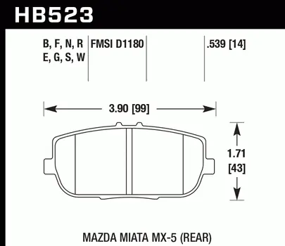 Klocki hamulcowe samochodoweHB523F.539 – HAWK Performance HPS(komplet na oś przednią)HAWK PERFORMANCE HPSKlocki hamulcowe High Performance Streetsą znane ze względu na zwiększanie siły hamowania w pojazdach dopuszczonych do ruchu ulicznego.Mieszanka High Performance Street oferuje wyższy współczynnik tarcianiż standardowe klocki hamulcowe i może zapewnić o 20-40% większą siłę hamowania i wyższą odporność na blaknięcie niż większość standardowych zamienników klocków.Mniejsze zanikanie oznacza lepsze wyczucie pedałui bardziej stałą wydajność w wytrzymałym klocku hamulcowym, który generuje mniej kurzu.Parametry techniczneSzerokość [mm]: 99Wysokość [mm]: 43Grubość [mm]: 14Rodzaj osi:tylna