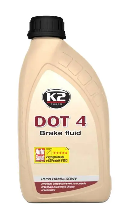 Opis produktu i zastosowanieK2 DOT 4 to w pełni syntetyczny najwyższej jakości płyn hamulcowy stosowany w układach hamulcowych i sprzęgłowych samochodów bardzo mocno obciążonych. Polecany przez profesjonalne warsztaty samochodowe.Płyn hamulcowy DOT 4 posiada doskonałe parametry reologiczne pozwalające na stosowanie w bardzo niskich temperaturach. Jest neutralny dla uszczelnień i stopów metali stosowanych w układzie hamulcowym oraz chroni go przed korozją. Płyn hamulcowy K2 DOT 4 posiada temperaturę wrzenia przekraczającą 230 st. C, dzięki czemu dłużej zachowuje on swoje właściwości. Produkt jest w pełni mieszalny z innymi płynami klasy DOT. K2 DOT 4 jest dedykowany do samochodów z systemami ABS, ESP, ASR, SBC. Spełnia wymagania normy obowiązującej w Polsce PN-C-40005:2002, a także norm amerykańskich FMVSS 116 DOT4, SAE J 1703, SAEJ 1704, ISO4925, Class 4, FMVSS 116.Posiada Certyfikat Zgodności Instytutu Transportu Samochodowego w Warszawie. Płyn hamulcowy K2 DOT 4 przeznaczony jest do wymiany we wszystkich typach samochodów, gdzie instrukcja obsługi nakazuje stosowanie płynu DOT 4 lub DOT 3.Zaleca się wymianę co 2 lata lub co 40 tys. kilometrów przebiegu.