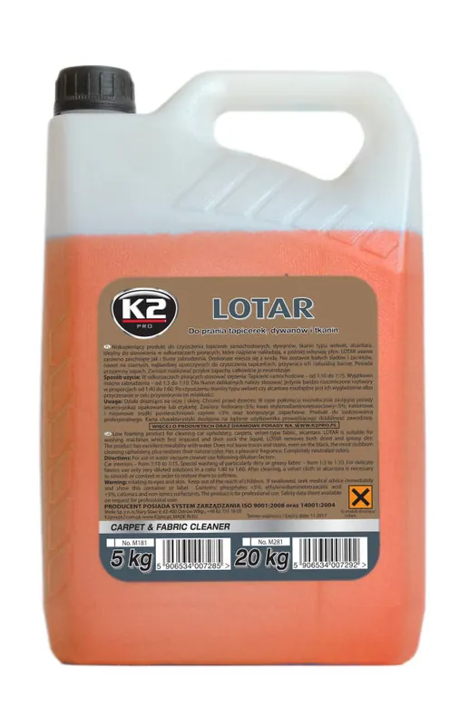 Opis produktu i zastosowanieNisko-pieniący detergent do czyszczenia dywanów oraz tkanin. LOTAR szczególnie nadaje się do zastosowania w urządzeniach do czyszczenia dywanów, które najpierw nakładają, a następnie zbierają detergent. Produkt ten wykazuje doskonałe właściwości czyszczące. Oprócz zdolności czyszczenia tkanin, również je odświeża. Nie powoduje odbarwień. Znajduje zastosowanie w czyszczeniu tapicerek samochodowych, tapczanów i foteli, wszelkiego rodzaju dywanów i powierzchni wyłożonych tkaniną, w tym tkaninami typu welwet oraz alcantara.Sposób użycia:W urządzeniach do czyszczenia dywanów/tkanin należy rozcieńczyć produkt z wodą zgodnie z następującymi współczynnikami rozcieńczania:Tapicerki samochodowe : od 1:10 do 1:15,Cotygodniowe czyszczenie dywanów w gospodarstwie domowym: od 1:25 do 1:50,Okresowe czyszczenie dywanów biurowych i gabinetowych: od 1:10 do 1:25,Czyszczenie specjalne wyjątkowo brudnych albo zatłuszczonych tkanin: od 1:3 do 1:10:Uwaga:Czas osuszania różni się znacznie w zależności od temperatury zewnętrznej; dla przeciętnie zabrudzonych powierzchni czyszczonych w typowy sposób, przeciętny czas suszenia wynosi 3-6 godzin.Zastosowanie gorącej wody przy rozcieńczaniu produktu przyspiesza czas suszenia.Przy czyszczeniu siedzeń samochodowych zaleca się wyjęcie ich z wnętrza samochodu poprzez ich wysunięcie; ułatwi to proces czyszczenia i przyspieszy osuszanie.Dla tkanin delikatnych należy stosować jedynie bardzo rozcieńczone roztwory w proporcjach 1:40-1:60.Po oczyszczeniu tkanin typu welwet czy alcantara nieodzowne jest ich wygładzenie albo przeczesanie w celu przywrócenia ich parametrów miękkości.