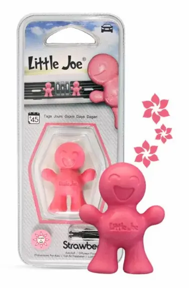 LITTLE JOE ZAPACH DO AUTA TRUSKAWKA Zapach trwa ażdo 45 dni Oryginalny kształt zapachów Little Joe znacznie odbiega od tradycyjnie pojmowanego odświeżacza samochodowego, doskonale łącząc innowacyjne wzornictwo zfunkcjonalnością. Stylowy design produktu sprawia, że zapachy te nietylko odświeżają, lecz również idealnie komponują się zwnętrzem każdego samochodu. Wyprodukowane we Włoszech odświeżacze powietrza Little Joe, to kolekcja zapachów wkształcie animowanych postaci 3D. Uwalniają one swój zapach winterakcji zwentylacją samochodową, która pomaga rozprowadzić go wcałym wnętrzu auta, emitując aktywne cząsteczki oraznaturalne olejki eteryczne. Dzięki specjalnemu klipsowi dopasowanemu do kratki wentylacyjnej, odświeżacz może być zainstalowany wpoziomie lub pionie.