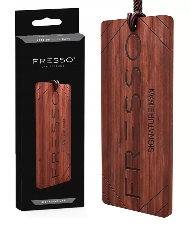 Fresso Signature Man Niezwykle gustowna, drewniana zawieszka zapachowa Fresso wzbogacona brązowym, plecionym sznurkiem to wyszukany dodatek, który świetnie pasuje do wnętrza każdego samochodu. Zawieszka posiada unikalną formę oraztrwały idoskonale skomponowany zapach. Naturalne pochodzenia sprawia, że każda zzawieszek różni się od siebie nieznacznie wyglądem. Nadaje to unikalności iwyjątkowości produktowi. Trwały istabilny zapach Unikalna receptura produktów Fresso bazuje na cennych składnikach, dzięki temu delikatna woń utrzymuje się nawet do 31 dni. Zmysłowe nuty zapachowe uwalniane są wsposób ciągły ikontrolowany. Wyeliminowano nagły, zbyt intensywny wyrzut zapachu, dlatego pozostaje on stabilny przezprawie cały okres przeznaczony do użytkowania zawieszki. Zapach: Signature Man Podkreślający męską siłę icechy fizyczne świadomego siebie mężczyzny. Wyróżnia się niezwykłą trwałością, która dodaje energii wintensywne dni. Wstępem do jego historii jest musująca bergamotka, cytryna ikorzenna świeżość pieprzu połączona zniezwykle aromatycznym kardamonem. Rozbudzone zmysły wędrują ścieżką delikatnych kwiatów- jaśminu, róży ibiałej konwalii. Wyraz jego siły izdecydowanego charakteru przebija się przezmieszankę mchu dębowego, drzewa cedrowego isandałowego. Zwieńczeniem jest delikatny zapach brazylijskiego drzewa różanego, piżma iwetywerii. Czynniki obniżające trwałość orazwyczuwalność zapachu: Niska temperatura (poniżej 5 stopni Celsjusza) lub skrajnie wysoka temperatura (powyżej 30 stopni Celsjusza). Regularne zostawianie auta wpełnym słońcu. Brak utrzymywania czystości waucie. Obecność innych (również zużytych) zapachów waucie. Przyzwyczajenie do zapachu. Brak okresowego czyszczenia klimatyzacji. Intensywny zapach tapicerki waucie. Sposób użycia: Wyjąć zawieszkę zpudełka. Zdjąć folię izamontować zawieszkę pod lusterkiem. Uwaga! Zawiesić zawieszkę swobodnie, aby niedotykała delikatnych powierzchni m.in. plastiku, skóry itp. Producent nieponosi odpowiedzialności za użytkowanie produktu niezgodne zjego przeznaczeniem. Wprzypadku złego samopoczucia lub zawrotów głowy natychmiast zaprzestać użytkowania produktu.