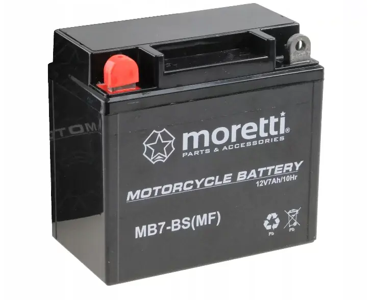 MORETTI AKUMULATOR ŻELOWY MB7-BS Kiedy motocykl jest bardziej naszpikowany elektroniką warto zainwestować wnieco droższe rozwiązanie. Akumulatory AGM są wykonane wnowszej technologii dlatego charakteryzują się dłuższą żywotnością imocniejszymi parametrami. Wich wnętrzu znajdują się maty zwłókna szklanego, ułożone pomiędzy płytami dodatnimi iujemnymi które zalane są elektrolitem. Jeżeli jest to akumulator, który został zalany już fabrycznie można go umieścić wmotocyklu pod dowolnym kątem, natomiast na rynku znaleźć można również AGMy, które należy zalać samemu, wtedy kąt przechyłu takiego akumulatora niepowinien przekraczać 45° aby niedopuścić do rozlania się elektrolitu. Ich zaletą jest przede wszystkim odporność na wstrząsy iwysoki prąd rozruchowy. Opis ogólny: typ: AGM (Gel) napięcie: 12V pojemność: 7Ah zalecane napięcie ładowania: 13.6V – 14,8V sugerowany prąd ładowania: 0,7A ( 10h ) waga: 2,8kg wymiary: sz.137x gł.77x w.127mm Zastępuje tradycyjne : CB7-A, YB7-A, 12N7-4A, 12N7B-4A może pracować wpozycji leżącej