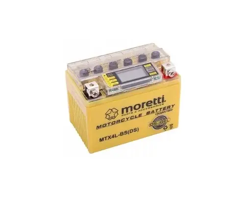 MORETTI AKUMULATOR ŻELOWY Z WYŚWIETLACZEM YTX4L-BS SKUTER 2T 4T Typ: YTX4L-BS zwyświetlaczem Wymiary (+/- 2mm): 113*70*85 mm Waga: 1,30 kg Napięcie: 12 V Pojemność 4,0 Ah Prąd rozruchowy 50 A Akumulator ten pasuje do większości skuterów opojemności 50cm3 które miały fabrycznie montowane akumulatory opojemności 4Ah. Linia akumulatorów Moretti zwyświetlaczem LCD dzięki wbudowanemu chipowi pozwala na łatwy odczyt danych iodpowiednie reagowanie na stany akumulatora. Pozwala to zmaksymalizować czas pracy baterii nawet do 6 lat! Wskazuje napięcie akumulatora: informuje opoziomie naładowania baterii ialarmuje ojej rozładowaniu. Mierzy czas pracy akumulatora od pierwszego podłączenia.