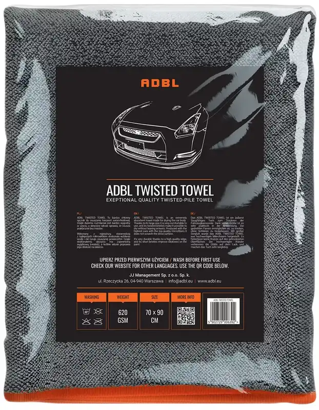 ADBL Twisted Towel to wyjątkowy ręcznik do osuszania karoserii samochodowej, który wyróżnia się swoją delikatnością iniezwykłą chłonnością. Kluczowe cechy produktu: Wyjątkowa chłonność: Dzięki specjalnie skręconemu włosiu, ręcznik doskonale wchłania wodę, osuszając powierzchnię niemal bez pozostawiania śladów, co pozwala na szybkie iefektywne osuszanie samochodu. Delikatność ibezpieczeństwo: Wykonany znajwyższej jakości mikrowłókien, ręcznik jest całkowicie bezpieczny dlalakieru iinnych delikatnych powierzchni. Trwałość: Specjalnie obszyte krawędzie zwiększają trwałość ręcznika, zapobiegając jego strzępieniu się irozciąganiu. Poręczność: Duży rozmiar (70 x 90 cm) orazgramatura 620 gsm zapewniają wygodne użytkowanie, jednocześnie umożliwiając skuteczne osuszanie większych powierzchni bez konieczności częstego wyżymania. Gładkość iśliskość: Krótkie włosie ręcznika poprawia jego śliskość na lakierze, co sprawia, że ręcznik łatwo przesuwa się po powierzchni, minimalizując ryzyko zarysowań. Łatwość pielęgnacji: Ręcznik można prać wtemperaturze 40°C, co ułatwia jego utrzymanie wczystości izachowanie właściwości przezdługi czas. ADBL Twisted Towel to doskonały wybór dlaosób, które chcą szybko ibezpiecznie osuszyć swój samochód, ciesząc się jednocześnie wygodą użytkowania itrwałością produktu.