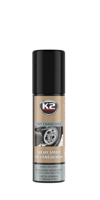 Opis produktu i zastosowanieK2 Suchy smar do łańcuchów ROAD – to wysoce wydajny smar, przeznaczony do smarowania łańcuchów oraz zębatek napędowych w motocyklach drogowych. Dzięki właściwościom smarująco-penetrującym, wnika we wszystkie szczeliny, chroniąc łańcuch oraz zębatki przed przedwczesnym zużyciem. Można go stosować we wszystkich typach łańcuchów, x-ring, o-ring, z-ring itp.Największą zaletą K2 suchego smaru do łańcucha jest to ,że w momencie aplikacji jest on płynny, dzięki czemu penetruje wszystkie elementy łańcucha. Natomiast po ok. 30 min tężeje, pozostawiając, przeźroczystą warstwę smarująco-ochronną. Warstwa ta niezwykle mocno przywiera do łańcucha, dzięki czemu nie odpada od niego w czasie jazdy. Przez co motocykl pozostaje czysty, a interwały pomiędzy kolejnymi smarowaniami mogą zostać wydłużone, ponieważ smar pozostaje na swoim miejscu zamiast chlapać na elementy takie jak koła czy wahacz.Częstotliwość smarowania łańcucha zależy od warunków, w jakich porusza się motocykl (deszcz, kurz, piasek, upał). Zalecamy smarowanie łańcucha co 400-500 km. Jednak interwał ten można wydłużać lub skracać w zależności od warunków panujących na drodze.Sposób użycia:Wstrząsnąć przed użyciem.Nanieść równomiernie na wewnętrzną część całego łańcucha.Przed dalszą jazdą odczekać ok. 30 min.W razie potrzeby nadmiar smaru wytrzeć miękką szmatką.W zależności od warunków polecamy smarowanie łańcucha motocykla co 400 – 500 km