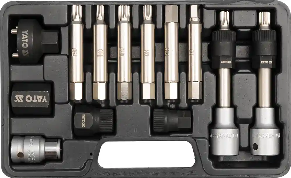 Zestaw kluczy do alternatora 13cz.Profesjonalny zestaw kluczy do montażu i demontażu alternatorów typ Bosch i Magneti Marelli.Dostosowany do samochodów marek: Audi, BMW, Fiat, Ford, Mercedes, Opel, Porsche, Renault, Peugeot, Seat, Skoda, Volvo, VW i innych.Klucze umożliwiają jednoczesne odkręcanie śruby mocującej koło pasowe (za pomocą odpowiedniego bitu) oraz przytrzymywanie koła ze sprzęgłem (za pomocą specjalistycznej nasadki).Parametry:- materiał: CrV, stal węglowa #45, stal 8600- zastosowanie: do alternatorów ze sprzęgłem Bosch i Magneti Marelli- twardość: 40-44, 38-42, 53-57 HRC- grot: Torx, sześciokątny, Spline- rozmiar uchwytu narzędziowego: 1/2″ (12.7 mm)- liczba sztuk w zestawie: 13