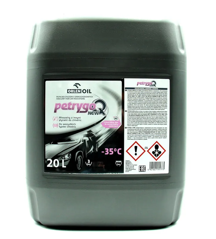 Opis produktu i zastosowanieNowa formuła najpopularniejszego w Polsce płynu chłodzącego. Płyn do chłodnic Petrygo Q NEW produkowany jest w oparciu o wysokiej jakości glikol etylenowy oraz specjalnie dobrany pakiet dodatków uszlachetniających, które zapewniają pełną ochronę układów chłodzenia wykonanych z aluminium, innych stopów metali oraz w układach mieszanych. Płyn tworzy w układzie chłodzenia wyjątkowo odporną powłokę ochronną, zabezpieczając go przed korozją i kawitacją w zakresie eksploatacji do 100 tyś km lub przez 3 lata eksploatacji. Jest odporny na zamarzanie do -35°C i zapewnia doskonałą ochronę silnika przed przegrzaniem. Petrygo Q NEW jest neutralny do stosowanych w układach chłodzenia elementów wykonanych z tworzyw sztucznych. Zoptymalizowana technologia gwarantuje dużą stabilność płynu w czasie długotrwałego przechowywania jak i w trakcie użytkowania. Jest mieszalny z innymi płynami chłodniczymi spełniającymi równorzędne parametry. Nie zawiera toksycznych azotynów, krzemianów, amin, boranów i fosforanów.