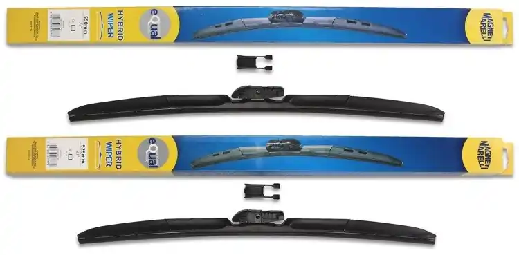 Nowe wycieraczki; zapakowane w oryginalne opakowanie producenta. Cena zakupu dotyczy 1kompletu (strona kierowcy i pasażera).  Wycieraczki hybrydowe Magneti Marelli to wyjątkowa konstrukcja i najwyższa jakość materiałów:- Guma – ponad 50% kauczuku naturalnego z grafitową powłoką; wewnątrz gumy podwójna stal nierdzewna.- Złącze – materiał POM (tworzywo termoplastyczne o wysokiej wytrzymałości mechanicznej i odporne na ciepło)- Spojler – materiał ABSWycieraczki montuje się bardzo szybko i sprawnie; obrazkowa instrukcja montażu znajduje się na ich opakowaniu.Zalety wycieraczek hybrydowych Magneti Marelli1.Jeden uniwersalny adapter w wycieraczkach hybrydowych Magneti Marelli znajduje zastosowanie w czterech różnych ramionach wycieraczek, co sprawia, że pasują do większości modeli samochodów.2. Sztywne gumowe pióro z grafitową powłoką w wycieraczce hybrydowej Magneti Marelli zapewnia bardziej skuteczne wycieranie powierzchni szyby.3. Wycieraczki hybrydowe Magneti Marelli dzięki zaawansowanej technologii, mogą zastąpić dotychczasowe tradycyjne wycieraczki w starszych modelach samochodów, a ich wymiana jest szybka i łatwa.4. Wycieraczki hybrydowe Magneti Marelli są odporne na niekorzystne warunki atmosferyczne ; zakres temperatury, w których ich praca odbywa się bez zakłóceń to -25ºC do +50ºC.5. Jakość materiałów użytych do produkcji wycieraczek hybrydowych Magneti Marelli zapewnia ich wytrzymałość oraz cichą pracę.6. Nowoczesny design zastosowany w wycieraczkach hybrydowych Magneti Marelli sprawia, że to jedne z bardziej poszukiwanych wycieraczek na świecie.  Jak dbać o wycieraczki:- pamiętaj, aby dbać o gumę wycieraczki usuwając z niej brud, owady itp., które osiadły podczas jej pracy (wykorzystać można do tego łagodny detergent); zapominanie o usuwaniu zanieczyszczeń, może doprowadzić do uszkodzenia gumy wycieraczki- nigdy nie używaj wycieraczek, gdy szyba jest sucha;  tarcie gumy po suchej szybie może doprowadzić do szybkiego jej zużycia- jeżeli wycieraczka na szybie podskakuje, może to być oznaką, że ramię wycieraczki jest skrzywione; w takim przypadku należy dokonać jego regulacji- jeżeli planujesz pozostawienie samochodu  na słońcu przez kilka dni, ustaw wycieraczki tak, aby nie stykały się z szybą- po wizycie na myjni, pamiętaj, aby zawsze dokładnie oczyścić szybę, ponieważ znajdujący się na niej wosk, może powodować przeskakiwanie wycieraczki- pamiętaj również, aby nie uruchamiać wycieraczek na zamarzniętej szybie; może to bowiem doprowadzić do ich uszkodzenia lub oderwania gumy od mocowania.