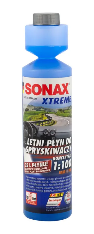 Opis produktu i zastosowanieWysoce skuteczny koncentrat płynu do spryskiwaczy szyb i reflektorów samochodowych o świeżym zapachu opracowany na bazie nanotechnologii. Niezwykle szybko usuwa z szyby warstwy brudu i tłuszczu ograniczające widoczność. Dzięki nowej formule jeszcze skuteczniej usuwa owady. Wygładza mikroskopijne nierówności na powierzchni szyby ułatwiając spływanie wody podczas jazdy. Wyjątkowa wydajność: z 25 ml uzyskuje się 2,5 l gotowego do użycia płynu do spryskiwaczy. Bezpieczna widoczność w sekundę.
