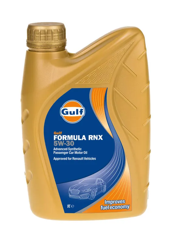 Opis produktu i zastosowanieGulf Formula RNX 5W 30 jest syntetycznym, kompatybilnym z nowoczesnymi systemami katalitycznymi olejem do silników samochodowych, zaprojektowanym z użyciem nowoczesnego, niskopopiołowego (low SAPS) pakietu dodatków, spełniającym normy Euro 4. Gulf Formula RNX 5W 30 jest specjalnie formułowany do smarowania w warunkach wysokiego ścinania i temperatury (HTHS>3.5mPa.s) silników benzynowych i diesla wyposażonych w filtry cząstek stałych (DPF) i trójdrożny katalizator (TWC), tak aby wydłużyć znacząco żywotność tych układów oczyszczania spalin. Gulf Formula RNX 5W 30 zapewnia doskonałą ochronę przeciwzużyciową i minimalizację odkładania się osadów w silniku i turbosprężarce. Olej został wyprodukowany w technologii, która pozwala przewyższyć wymagania stawiane przez najnowsze modele aut Renault i innych producentów wymagających zalania silnika olejem spełniającym normę ACEA C4.