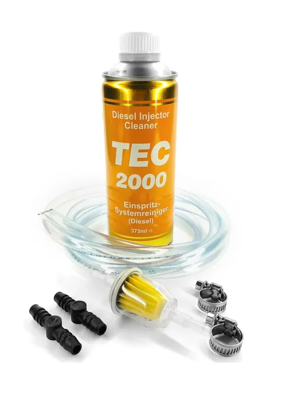 Zestaw zawiera: 1x Preparat TEC-2000 Diesel Injector Cleaner 1x Filtr paliwa do węży 8 mm 1x Wąż ogrubości 8 mm, idługości 2 m (ucięty pod skosem) 2x Łączniki plastikowe do węży ogrubości 8 mm 2x Zaciski metalowe 8-16 mm TEC2000 DIESEL INJECTOR CLEANER 375ML Jak działa ? Czyści wtryskiwacze orazdysze wtryskiwaczy, przezco znacząco poprawia atomizację orazstrumień wtryskiwanego paliwa. Preparat poprawia spalanie paliwa orazwymiernie zmniejsza ilość charakterystycznego czarnego dymu wydobywającego się zukładu wydechowego. Testy przeprowadzone wśrodowisku laboratoryjnym przezniezależne biura certyfikacyjne, jednoznacznie wskazują, że zastosowanie TEC-2000 Diesel Injector Cleaner natychmiast redukuję emisję szkodliwych spalin o60% orazzwiększa moc o10%. Zanotowano również zmniejszenie zużycia paliwa od 4% do 8% przy regularnym stosowaniu preparatu. Co to jest ? TEC-2000 Diesel Injector Cleaner jest wielofunkcyjnym preparatem czyszczącym wtryskiwacze, przeznaczonym dlasilników diesla. Opracowana przeznas formuła preparatu jest testowana na całym Świecie od przeszło 10 lat iciągle doskonalona. Zarówno składniki podstawowe jak iaktywne preparatu zostały zaprojektowane wStanach Zjednoczonych. Finalny produkt, który przekazujemy klientom jest obecnie najlepszym tego rodzaju preparatem na Świecie. Jak stosować ? Najlepiej jest podawać bezpośrednio do listwy wtryskiwaczy. Można do tego użyć profesjonalnego dozownika Flo-Tec Injector Cleaner lub uniwersalnego aparatu oferowanego przezszereg firm na rynku. Procedura zajmuje ok 20 minut. Podstawowa procedura polega na: Odłączeniu przewodów paliwowych zasilający ipowrotnych od listwy. W miejsce fabrycznych przewodów wpinamy przewody serwisowe Flo-Tec a ich wolne końce umieszczamy wpuszcze zpreparatem TEC-2000 Dieles Injection Cleaner. Włączyć silnik, od tej chwili silnik pracuje na TEC-2000 DIC, jedna puszka tj. 375 ml wystarcza na ok 20 minut pracy. W momencie gdy puszka jest już pusta należy wyłączyć silnik. Odpiąć przewody serwisowe. Wpiąć przewody fabryczne. Czyszczenie jest zakończone, jednak wwypadku gdy efekt jest częściowy lub wtryskiwacze były szczególnie mocno zanieczyszczone zaleca się powtórzenie całej operacji. Alternatywnie preparat może być podany poprzez napełnienie zbiornika filtra paliwa wpojazdach, wktórych jest to uzasadnione przezłatwy dostęp do filtra. Po wykonaniu powyższych czynności należy uruchomić silnik na biegu jałowym na ok 20 minut. Ostatnie zrozwiązań, jeśli żaden zpowyższych wariantów jest niemożliwy do zastosowania. Należy włożyć koniec rury ssącej zpompy paliwowej pojazdu do puszki TEC-2000 Diesel Injector Cleaner, jednocześnie rura „powrót do zbiornika” również powinna być włożona do puszki. Silnik powinien pracować tak długo ażzawartość puszki zostanie prawie opróżniona. Chcąc uzyskać lepsze efekty wsilnikach odużych przebiegach, zalecamy przedłużyć procedurę okolejne 20 minut, wykorzystując dodatkową puszkę 375 ml TEC-2000 Diesel Injection Cleaner.
