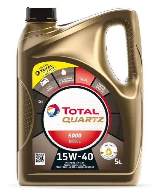 Opis produktu i zastosowanieTOTAL QUARTZ 5000 DIESEL 15W-40 jest wielosezonowym olejem silnikowym zaprojektowanym, aby spełniać najbardziej rygorystyczne wymagania silników Diesla bez filtrów cząstek stałych (DPF). Może być stosowany w silnikach pracujących w różnych warunkach (ruch miejski, pozamiejski, autostrady) niezależnie od pory roku.Zapewnia optymalną czystość i ochronę silnika. Unikatowa formulacja zapewnia wysoką odporność na utlenianie.