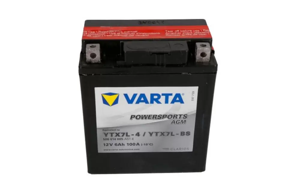 VARTA AGM YTX7L-BS 6AH 100A P+ Napięcie:12V Pojemność:6.Ah Prąd rozruchowy:100A Polaryzacja: Prawy plus Odpowietrznik:Brak Technologia:Absorbed Glass Mat (AGM) Wymiary:114mm (Długość) 71mm (Szerokość) 131mm (Wysokość) Końcówki biegunowe:5 Zestaw zawiera:Śrubki, elektrolit do uruchomienia Dodatkowe informacje:Bezobsługowy (po uruchomieniu)