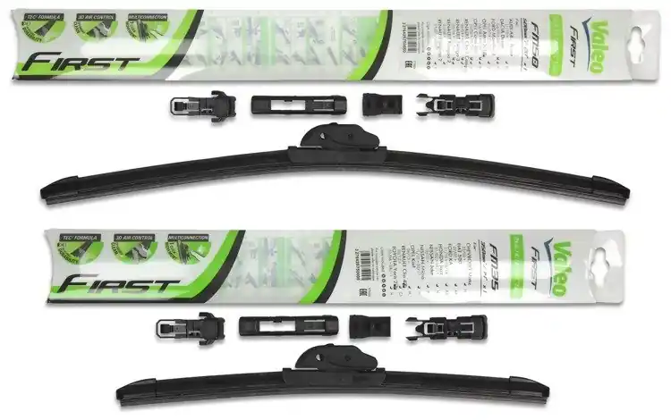 Nowe wycieraczki; zapakowane w oryginalne opakowanie producenta. Cena zakupu dotyczy 1kompletu (strona kierowcy i pasażera).Wycieraczki Valeo First Multiconnection to wysoka jakość i atrakcyjna cena.Bezszkieletowe wycieraczki Valeo First posiadają metalowe listwy, które zapewniają optymalny docisk do powierzchni szyby, a tym samym doskonałą widoczność nawet w niekorzystnych warunkach atmosferycznych.Gumowe pióra wycieraczek wykonane są ze specjalnej mieszanki obrabianego kauczuku, co znacznie poprawia skuteczność czyszczenia powierzchni szyby.Innowacyjny kształt spojlera w technologii „PYRAMID” zapewnia optymalny docisk do powierzchni szyby oraz cichą pracę nawet przy dużych prędkościach.Na opakowaniu wycieraczek First Multiconnection podany jest sposób ich montażu oraz przykładowa lista zastosowań.Wycieraczki First zostały zaprojektowane i wyprodukowane na całkowicie zautomatyzowanych liniach montażowych w nowych fabrykach Valeo.W opakowaniu wycieraczek First Multiconnection znajduje się kilka adapterów. Klient samodzielnie wybiera i montuje właściwy adapter. Zalety wycieraczek Valeo First Multiconnection:- bardzo łatwy montaż- precyzyjne wycieranie szyby- zmniejszenie szumu powietrza poprzez bardziej opływowy kształt- nie zamarzanie zimą poszczególnych elementów wycieraczki- nowoczesny wygląd- spojler na całej długości, poprawiający przyleganie wycieraczki do powierzchni szyby przy dużych  prędkościach.Jak dbać o wycieraczki:- pamiętaj, aby dbać o gumę wycieraczki usuwając z niej brud, owady itp., które osiadły podczas jej pracy (wykorzystać można do tego łagodny detergent); zapominanie o usuwaniu zanieczyszczeń, może doprowadzić do uszkodzenia gumy wycieraczki- nigdy nie używaj wycieraczek, gdy szyba jest sucha;  tarcie gumy po suchej szybie może doprowadzić do szybkiego jej zużycia- jeżeli wycieraczka na szybie podskakuje, może to być oznaką, że ramię wycieraczki jest skrzywione; w takim przypadku należy dokonać jego regulacji- jeżeli planujesz pozostawienie samochodu  na słońcu przez kilka dni, ustaw wycieraczki tak, aby nie stykały się z szybą- po wizycie na myjni, pamiętaj, aby zawsze dokładnie oczyścić szybę, ponieważ znajdujący się na niej wosk, może powodować przeskakiwanie wycieraczki- pamiętaj również, aby nie uruchamiać wycieraczek na zamarzniętej szybie; może to bowiem doprowadzić do ich uszkodzenia lub oderwania gumy od mocowania.
