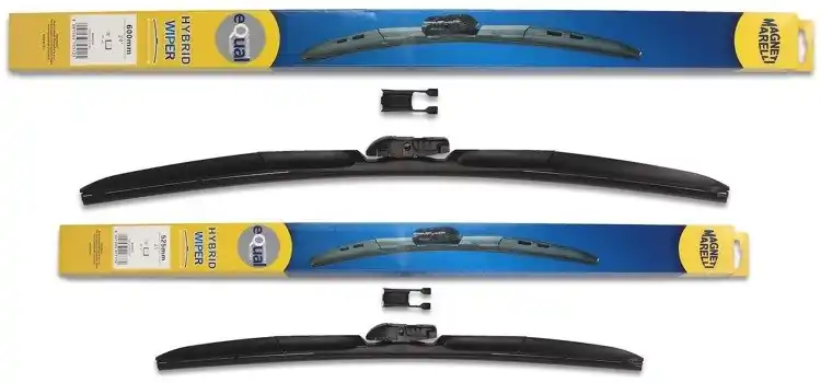Nowe wycieraczki; zapakowane w oryginalne opakowanie producenta. Cena zakupu dotyczy 1kompletu (strona kierowcy i pasażera).  Wycieraczki hybrydowe Magneti Marelli to wyjątkowa konstrukcja i najwyższa jakość materiałów:- Guma – ponad 50% kauczuku naturalnego z grafitową powłoką; wewnątrz gumy podwójna stal nierdzewna.- Złącze – materiał POM (tworzywo termoplastyczne o wysokiej wytrzymałości mechanicznej i odporne na ciepło)- Spojler – materiał ABSWycieraczki montuje się bardzo szybko i sprawnie; obrazkowa instrukcja montażu znajduje się na ich opakowaniu.Zalety wycieraczek hybrydowych Magneti Marelli1.Jeden uniwersalny adapter w wycieraczkach hybrydowych Magneti Marelli znajduje zastosowanie w czterech różnych ramionach wycieraczek, co sprawia, że pasują do większości modeli samochodów.2. Sztywne gumowe pióro z grafitową powłoką w wycieraczce hybrydowej Magneti Marelli zapewnia bardziej skuteczne wycieranie powierzchni szyby.3. Wycieraczki hybrydowe Magneti Marelli dzięki zaawansowanej technologii, mogą zastąpić dotychczasowe tradycyjne wycieraczki w starszych modelach samochodów, a ich wymiana jest szybka i łatwa.4. Wycieraczki hybrydowe Magneti Marelli są odporne na niekorzystne warunki atmosferyczne ; zakres temperatury, w których ich praca odbywa się bez zakłóceń to -25ºC do +50ºC.5. Jakość materiałów użytych do produkcji wycieraczek hybrydowych Magneti Marelli zapewnia ich wytrzymałość oraz cichą pracę.6. Nowoczesny design zastosowany w wycieraczkach hybrydowych Magneti Marelli sprawia, że to jedne z bardziej poszukiwanych wycieraczek na świecie.  Jak dbać o wycieraczki:- pamiętaj, aby dbać o gumę wycieraczki usuwając z niej brud, owady itp., które osiadły podczas jej pracy (wykorzystać można do tego łagodny detergent); zapominanie o usuwaniu zanieczyszczeń, może doprowadzić do uszkodzenia gumy wycieraczki- nigdy nie używaj wycieraczek, gdy szyba jest sucha;  tarcie gumy po suchej szybie może doprowadzić do szybkiego jej zużycia- jeżeli wycieraczka na szybie podskakuje, może to być oznaką, że ramię wycieraczki jest skrzywione; w takim przypadku należy dokonać jego regulacji- jeżeli planujesz pozostawienie samochodu  na słońcu przez kilka dni, ustaw wycieraczki tak, aby nie stykały się z szybą- po wizycie na myjni, pamiętaj, aby zawsze dokładnie oczyścić szybę, ponieważ znajdujący się na niej wosk, może powodować przeskakiwanie wycieraczki- pamiętaj również, aby nie uruchamiać wycieraczek na zamarzniętej szybie; może to bowiem doprowadzić do ich uszkodzenia lub oderwania gumy od mocowania.