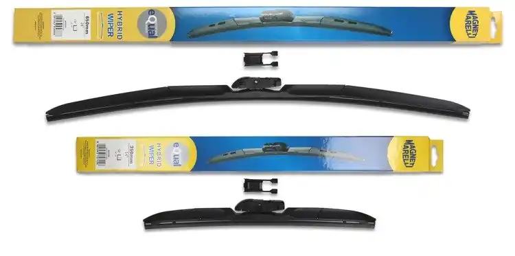 Nowe wycieraczki; zapakowane w oryginalne opakowanie producenta. Cena zakupu dotyczy 1kompletu (strona kierowcy i pasażera).  Wycieraczki hybrydowe Magneti Marelli to wyjątkowa konstrukcja i najwyższa jakość materiałów:- Guma – ponad 50% kauczuku naturalnego z grafitową powłoką; wewnątrz gumy podwójna stal nierdzewna.- Złącze – materiał POM (tworzywo termoplastyczne o wysokiej wytrzymałości mechanicznej i odporne na ciepło)- Spojler – materiał ABSWycieraczki montuje się bardzo szybko i sprawnie; obrazkowa instrukcja montażu znajduje się na ich opakowaniu.Zalety wycieraczek hybrydowych Magneti Marelli1.Jeden uniwersalny adapter w wycieraczkach hybrydowych Magneti Marelli znajduje zastosowanie w czterech różnych ramionach wycieraczek, co sprawia, że pasują do większości modeli samochodów.2. Sztywne gumowe pióro z grafitową powłoką w wycieraczce hybrydowej Magneti Marelli zapewnia bardziej skuteczne wycieranie powierzchni szyby.3. Wycieraczki hybrydowe Magneti Marelli dzięki zaawansowanej technologii, mogą zastąpić dotychczasowe tradycyjne wycieraczki w starszych modelach samochodów, a ich wymiana jest szybka i łatwa.4. Wycieraczki hybrydowe Magneti Marelli są odporne na niekorzystne warunki atmosferyczne ; zakres temperatury, w których ich praca odbywa się bez zakłóceń to -25ºC do +50ºC.5. Jakość materiałów użytych do produkcji wycieraczek hybrydowych Magneti Marelli zapewnia ich wytrzymałość oraz cichą pracę.6. Nowoczesny design zastosowany w wycieraczkach hybrydowych Magneti Marelli sprawia, że to jedne z bardziej poszukiwanych wycieraczek na świecie.  Jak dbać o wycieraczki:- pamiętaj, aby dbać o gumę wycieraczki usuwając z niej brud, owady itp., które osiadły podczas jej pracy (wykorzystać można do tego łagodny detergent); zapominanie o usuwaniu zanieczyszczeń, może doprowadzić do uszkodzenia gumy wycieraczki- nigdy nie używaj wycieraczek, gdy szyba jest sucha;  tarcie gumy po suchej szybie może doprowadzić do szybkiego jej zużycia- jeżeli wycieraczka na szybie podskakuje, może to być oznaką, że ramię wycieraczki jest skrzywione; w takim przypadku należy dokonać jego regulacji- jeżeli planujesz pozostawienie samochodu  na słońcu przez kilka dni, ustaw wycieraczki tak, aby nie stykały się z szybą- po wizycie na myjni, pamiętaj, aby zawsze dokładnie oczyścić szybę, ponieważ znajdujący się na niej wosk, może powodować przeskakiwanie wycieraczki- pamiętaj również, aby nie uruchamiać wycieraczek na zamarzniętej szybie; może to bowiem doprowadzić do ich uszkodzenia lub oderwania gumy od mocowania.