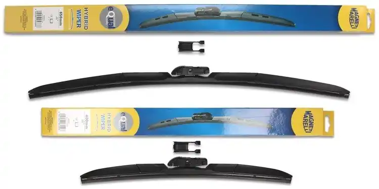 Nowe wycieraczki; zapakowane w oryginalne opakowanie producenta. Cena zakupu dotyczy 1kompletu (strona kierowcy i pasażera).  Wycieraczki hybrydowe Magneti Marelli to wyjątkowa konstrukcja i najwyższa jakość materiałów:- Guma – ponad 50% kauczuku naturalnego z grafitową powłoką; wewnątrz gumy podwójna stal nierdzewna.- Złącze – materiał POM (tworzywo termoplastyczne o wysokiej wytrzymałości mechanicznej i odporne na ciepło)- Spojler – materiał ABSWycieraczki montuje się bardzo szybko i sprawnie; obrazkowa instrukcja montażu znajduje się na ich opakowaniu.Zalety wycieraczek hybrydowych Magneti Marelli1.Jeden uniwersalny adapter w wycieraczkach hybrydowych Magneti Marelli znajduje zastosowanie w czterech różnych ramionach wycieraczek, co sprawia, że pasują do większości modeli samochodów.2. Sztywne gumowe pióro z grafitową powłoką w wycieraczce hybrydowej Magneti Marelli zapewnia bardziej skuteczne wycieranie powierzchni szyby.3. Wycieraczki hybrydowe Magneti Marelli dzięki zaawansowanej technologii, mogą zastąpić dotychczasowe wycieraczki, a ich wymiana jest szybka i łatwa.4. Wycieraczki hybrydowe Magneti Marelli są odporne na niekorzystne warunki atmosferyczne ; zakres temperatury, w których ich praca odbywa się bez zakłóceń to -25ºC do +50ºC.5. Jakość materiałów użytych do produkcji wycieraczek hybrydowych Magneti Marelli zapewnia ich wytrzymałość oraz cichą pracę.6. Nowoczesny design zastosowany w wycieraczkach hybrydowych Magneti Marelli sprawia, że to jedne z bardziej poszukiwanych wycieraczek na świecie.  Jak dbać o wycieraczki:- pamiętaj, aby dbać o gumę wycieraczki usuwając z niej brud, owady itp., które osiadły podczas jej pracy (wykorzystać można do tego łagodny detergent); zapominanie o usuwaniu zanieczyszczeń, może doprowadzić do uszkodzenia gumy wycieraczki- nigdy nie używaj wycieraczek, gdy szyba jest sucha;  tarcie gumy po suchej szybie może doprowadzić do szybkiego jej zużycia- jeżeli wycieraczka na szybie podskakuje, może to być oznaką, że ramię wycieraczki jest skrzywione; w takim przypadku należy dokonać jego regulacji- jeżeli planujesz pozostawienie samochodu  na słońcu przez kilka dni, ustaw wycieraczki tak, aby nie stykały się z szybą- po wizycie na myjni, pamiętaj, aby zawsze dokładnie oczyścić szybę, ponieważ znajdujący się na niej wosk, może powodować przeskakiwanie wycieraczki- pamiętaj również, aby nie uruchamiać wycieraczek na zamarzniętej szybie; może to bowiem doprowadzić do ich uszkodzenia lub oderwania gumy od mocowania.