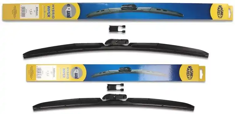 Nowe wycieraczki; zapakowane w oryginalne opakowanie producenta. Cena zakupu dotyczy 1kompletu (strona kierowcy i pasażera).  Wycieraczki hybrydowe Magneti Marelli to wyjątkowa konstrukcja i najwyższa jakość materiałów:- Guma – ponad 50% kauczuku naturalnego z grafitową powłoką; wewnątrz gumy podwójna stal nierdzewna.- Złącze – materiał POM (tworzywo termoplastyczne o wysokiej wytrzymałości mechanicznej i odporne na ciepło)- Spojler – materiał ABSWycieraczki montuje się bardzo szybko i sprawnie; obrazkowa instrukcja montażu znajduje się na ich opakowaniu.Zalety wycieraczek hybrydowych Magneti Marelli1.Jeden uniwersalny adapter w wycieraczkach hybrydowych Magneti Marelli znajduje zastosowanie w czterech różnych ramionach wycieraczek, co sprawia, że pasują do większości modeli samochodów.2. Sztywne gumowe pióro z grafitową powłoką w wycieraczce hybrydowej Magneti Marelli zapewnia bardziej skuteczne wycieranie powierzchni szyby.3. Wycieraczki hybrydowe Magneti Marelli dzięki zaawansowanej technologii, mogą zastąpić dotychczasowe wycieraczki, a ich wymiana jest szybka i łatwa.4. Wycieraczki hybrydowe Magneti Marelli są odporne na niekorzystne warunki atmosferyczne ; zakres temperatury, w których ich praca odbywa się bez zakłóceń to -25ºC do +50ºC.5. Jakość materiałów użytych do produkcji wycieraczek hybrydowych Magneti Marelli zapewnia ich wytrzymałość oraz cichą pracę.6. Nowoczesny design zastosowany w wycieraczkach hybrydowych Magneti Marelli sprawia, że to jedne z bardziej poszukiwanych wycieraczek na świecie.  Jak dbać o wycieraczki:- pamiętaj, aby dbać o gumę wycieraczki usuwając z niej brud, owady itp., które osiadły podczas jej pracy (wykorzystać można do tego łagodny detergent); zapominanie o usuwaniu zanieczyszczeń, może doprowadzić do uszkodzenia gumy wycieraczki- nigdy nie używaj wycieraczek, gdy szyba jest sucha;  tarcie gumy po suchej szybie może doprowadzić do szybkiego jej zużycia- jeżeli wycieraczka na szybie podskakuje, może to być oznaką, że ramię wycieraczki jest skrzywione; w takim przypadku należy dokonać jego regulacji- jeżeli planujesz pozostawienie samochodu  na słońcu przez kilka dni, ustaw wycieraczki tak, aby nie stykały się z szybą- po wizycie na myjni, pamiętaj, aby zawsze dokładnie oczyścić szybę, ponieważ znajdujący się na niej wosk, może powodować przeskakiwanie wycieraczki- pamiętaj również, aby nie uruchamiać wycieraczek na zamarzniętej szybie; może to bowiem doprowadzić do ich uszkodzenia lub oderwania gumy od mocowania.