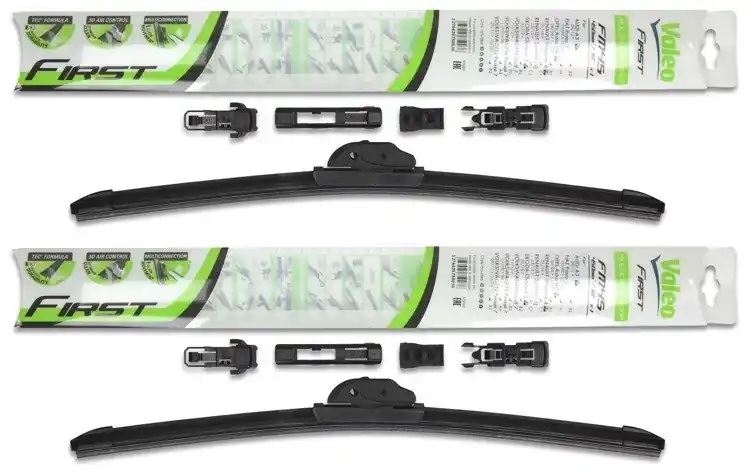Nowe wycieraczki; zapakowane w oryginalne opakowanie producenta. Cena zakupu dotyczy 1kompletu (strona kierowcy i pasażera).Wycieraczki Valeo First Multiconnection to wysoka jakość i atrakcyjna cena.Bezszkieletowe wycieraczki Valeo First posiadają metalowe listwy, które zapewniają optymalny docisk do powierzchni szyby, a tym samym doskonałą widoczność nawet w niekorzystnych warunkach atmosferycznych.Gumowe pióra wycieraczek wykonane są ze specjalnej mieszanki obrabianego kauczuku, co znacznie poprawia skuteczność czyszczenia powierzchni szyby.Innowacyjny kształt spojlera w technologii „PYRAMID” zapewnia optymalny docisk do powierzchni szyby oraz cichą pracę nawet przy dużych prędkościach.Na opakowaniu wycieraczek First Multiconnection podany jest sposób ich montażu oraz przykładowa lista zastosowań.Wycieraczki First zostały zaprojektowane i wyprodukowane na całkowicie zautomatyzowanych liniach montażowych w nowych fabrykach Valeo.W opakowaniu wycieraczek First Multiconnection znajduje się kilka adapterów. Klient samodzielnie wybiera i montuje właściwy adapter. Zalety wycieraczek Valeo First Multiconnection:- bardzo łatwy montaż- precyzyjne wycieranie szyby- zmniejszenie szumu powietrza poprzez bardziej opływowy kształt- nie zamarzanie zimą poszczególnych elementów wycieraczki- nowoczesny wygląd- spojler na całej długości, poprawiający przyleganie wycieraczki do powierzchni szyby przy dużych  prędkościach.Jak dbać o wycieraczki:- pamiętaj, aby dbać o gumę wycieraczki usuwając z niej brud, owady itp., które osiadły podczas jej pracy (wykorzystać można do tego łagodny detergent); zapominanie o usuwaniu zanieczyszczeń, może doprowadzić do uszkodzenia gumy wycieraczki- nigdy nie używaj wycieraczek, gdy szyba jest sucha;  tarcie gumy po suchej szybie może doprowadzić do szybkiego jej zużycia- jeżeli wycieraczka na szybie podskakuje, może to być oznaką, że ramię wycieraczki jest skrzywione; w takim przypadku należy dokonać jego regulacji- jeżeli planujesz pozostawienie samochodu  na słońcu przez kilka dni, ustaw wycieraczki tak, aby nie stykały się z szybą- po wizycie na myjni, pamiętaj, aby zawsze dokładnie oczyścić szybę, ponieważ znajdujący się na niej wosk, może powodować przeskakiwanie wycieraczki- pamiętaj również, aby nie uruchamiać wycieraczek na zamarzniętej szybie; może to bowiem doprowadzić do ich uszkodzenia lub oderwania gumy od mocowania.