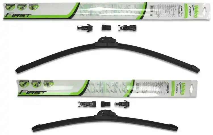 Nowe wycieraczki; zapakowane w oryginalne opakowanie producenta. Cena zakupu dotyczy 1kompletu (strona kierowcy i pasażera).Wycieraczki Valeo First Multiconnection to wysoka jakość i atrakcyjna cena.Bezszkieletowe wycieraczki Valeo First posiadają metalowe listwy, które zapewniają optymalny docisk do powierzchni szyby, a tym samym doskonałą widoczność nawet w niekorzystnych warunkach atmosferycznych.Gumowe pióra wycieraczek wykonane są ze specjalnej mieszanki obrabianego kauczuku, co znacznie poprawia skuteczność czyszczenia powierzchni szyby.Innowacyjny kształt spojlera w technologii „PYRAMID” zapewnia optymalny docisk do powierzchni szyby oraz cichą pracę nawet przy dużych prędkościach.Na opakowaniu wycieraczek First Multiconnection podany jest sposób ich montażu oraz przykładowa lista zastosowań.Wycieraczki First zostały zaprojektowane i wyprodukowane na całkowicie zautomatyzowanych liniach montażowych w nowych fabrykach Valeo.W opakowaniu wycieraczek First Multiconnection znajduje się kilka adapterów. Klient samodzielnie wybiera i montuje właściwy adapter. Zalety wycieraczek Valeo First Multiconnection:- bardzo łatwy montaż- precyzyjne wycieranie szyby- zmniejszenie szumu powietrza poprzez bardziej opływowy kształt- nie zamarzanie zimą poszczególnych elementów wycieraczki- nowoczesny wygląd- spojler na całej długości, poprawiający przyleganie wycieraczki do powierzchni szyby przy dużych  prędkościach.Jak dbać o wycieraczki:- pamiętaj, aby dbać o gumę wycieraczki usuwając z niej brud, owady itp., które osiadły podczas jej pracy (wykorzystać można do tego łagodny detergent); zapominanie o usuwaniu zanieczyszczeń, może doprowadzić do uszkodzenia gumy wycieraczki- nigdy nie używaj wycieraczek, gdy szyba jest sucha;  tarcie gumy po suchej szybie może doprowadzić do szybkiego jej zużycia- jeżeli wycieraczka na szybie podskakuje, może to być oznaką, że ramię wycieraczki jest skrzywione; w takim przypadku należy dokonać jego regulacji- jeżeli planujesz pozostawienie samochodu  na słońcu przez kilka dni, ustaw wycieraczki tak, aby nie stykały się z szybą- po wizycie na myjni, pamiętaj, aby zawsze dokładnie oczyścić szybę, ponieważ znajdujący się na niej wosk, może powodować przeskakiwanie wycieraczki- pamiętaj również, aby nie uruchamiać wycieraczek na zamarzniętej szybie; może to bowiem doprowadzić do ich uszkodzenia lub oderwania gumy od mocowania.