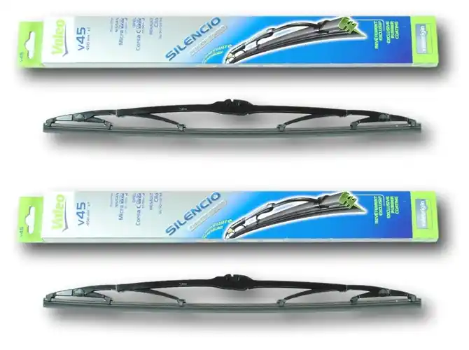 Nowe wycieraczki – zapakowane w oryginalne opakowanie producenta – cena zakupu dotyczy 1kompletu (strona kierowcy i pasażera).Wycieraczki Valeo Silencio na przednią szybę posiadają konstrukcję klasyczną i zbudowane są z metalowych przegubów. Specjalny skład gumy sprawia, że doskonale spisują się w każdych warunkach atmosferycznych. Guma posiada specjalne struktury(kanaliki) do rozprowadzania „płynu do spryskiwaczy” po całej powierzchni szyby. Ponadto guma wycieraczki pokryta została specjalną warstwą grafitu zapewniającą optymalne wycieranie szyby. Gama wycieraczek Valeo Silencio to najwyżej sklasyfikowana gama klasycznych wycieraczek firmy Valeo. Wycieraczki posiadają wskaźnik zużycia, który stopniowo zmienia kolor z czarnego na żółty, sygnalizując potrzebę ewentualnej ich wymiany. Wycieraczki montuje się bardzo szybko i sprawnie; obrazkowa instrukcja montażu znajduje się na ich opakowaniu.Zalety wycieraczek Valeo Silencio:- bardzo łatwy montaż- precyzyjne wycieranie szyby- najwyższa jakość wykonania oraz zastosowanych materiałówJak dbać o wycieraczki:- pamiętaj, aby dbać o gumę wycieraczki usuwając z niej brud, owady itp., które osiadły podczas jej pracy (wykorzystać można do tego łagodny detergent); zapominanie o usuwaniu zanieczyszczeń, może doprowadzić do uszkodzenia gumy wycieraczki- nigdy nie używaj wycieraczek, gdy szyba jest sucha; tarcie gumy po suchej szybie może doprowadzić do szybkiego jej zużycia- jeżeli wycieraczka na szybie podskakuje, może to być oznaką, że ramię wycieraczki jest skrzywione; w takim przypadku należy dokonać jego regulacji- jeżeli planujesz pozostawienie samochodu na słońcu przez kilka dni, ustaw wycieraczki tak, aby nie stykały się z szybą- po wizycie na myjni, pamiętaj, aby zawsze dokładnie oczyścić szybę, ponieważ znajdujący się na niej wosk, może powodować przeskakiwanie wycieraczki- pamiętaj również, aby nie uruchamiać wycieraczek na zamarzniętej szybie, może to bowiem doprowadzić do ich uszkodzenia lub oderwania gumy od mocowania.
