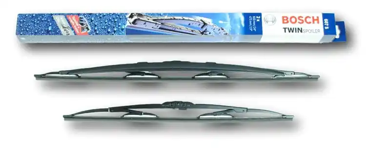 Nowe wycieraczki – zapakowane w oryginalne opakowanie producenta – cena zakupu dotyczy 1kompletu (strona kierowcy i pasażera).Wycieraczki Bosch Twin – na przednią szybę – posiadają metalowy stelaż. Jest on bardzo solidny i dwukrotnie lakierowany. Wewnątrz gumy znajduje się szyna stabilizująca odpowiadająca za prawidłowe przyleganie wycieraczki. Do konstrukcji pióra wycieraczki zastosowano 2 rodzaje gumy. Na górze znajduje się część miękka odpowiadająca za cichą pracę, natomiast na dole twarda, która ma za zadanie precyzyjne czyszczenie szyby ze śniegu, wody itp. Dodatkowo pokryta jest specjalną powłoką, powodującą lepszy poślizg na szybie, aby siła tarcia była jak najmniejsza. Prawidłowe działanie wycieraczki przy dużych prędkościach, firma Bosch  zapewniła, stosując spojler, dzięki któremu wycieraczka jest odpowiednio dociskana do szyby. Zalecany jest on od strony kierowcy.Jak dbać o wycieraczki:- pamiętaj, aby dbać o gumę wycieraczki usuwając z niej brud, owady itp., które osiadły podczas jej pracy (wykorzystać można do tego łagodny detergent); zapominanie o usuwaniu zanieczyszczeń, może doprowadzić do uszkodzenia gumy wycieraczki- nigdy nie używaj wycieraczek, gdy szyba jest sucha;  tarcie gumy po suchej szybie może doprowadzić do szybkiego jej zużycia- jeżeli wycieraczka na szybie podskakuje, może to być oznaką, że ramię wycieraczki jest skrzywione; w takim przypadku należy dokonać jego regulacji- jeżeli planujesz pozostawienie samochodu na słońcu przez kilka dni, ustaw wycieraczki tak, aby nie stykały się z szybą- po wizycie na myjni, pamiętaj, aby zawsze dokładnie oczyścić szybę, ponieważ znajdujący się na niej wosk, może powodować przeskakiwanie wycieraczki- pamiętaj również, aby nie uruchamiać wycieraczek na zamarzniętej szybie; może to bowiem doprowadzić do ich uszkodzenia lub oderwania gumy od mocowania.Czy wiesz że:- pierwsza wycieraczka wprowadzona została przez Boscha w okresie międzywojennym w 1926r. i napędzana była silnikiem elektrycznym- pierwszą wycieraczkę bezprzegubową – Bosch wprowadził do produkcji w 1999r.- 750 000 cykli oczyszczania! Tak wycieraczki Bosch są testowane pod kątem wytrzymałości mechanicznej- wycieraczki Bosch są przystosowane do pracy w temperaturach od -30 do +80 stopni Celsjusza.