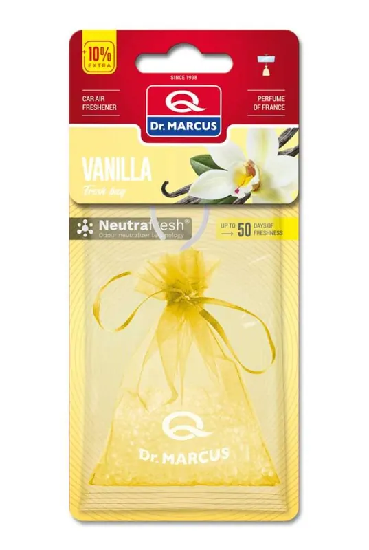 Opis produktu i zastosowanieWszechobecne doznania zamknięte w małym woreczku. Nasączone polimerowe kulki francuskimi perfumami zamknięte w szykownym woreczku z praktycznym sznurkiem. Woreczków Dr. Marcus można używać w samochodzie, ale także np. w szafach lub szufladach.To dyskretny i gustowny dodatek do każdego wnętrza, a także świetny pomysł na prezent. Produkt może być używany do samochodu, domu i biura. Zapach uwalnia się powoli do 45 dni. Waga: 20 g.