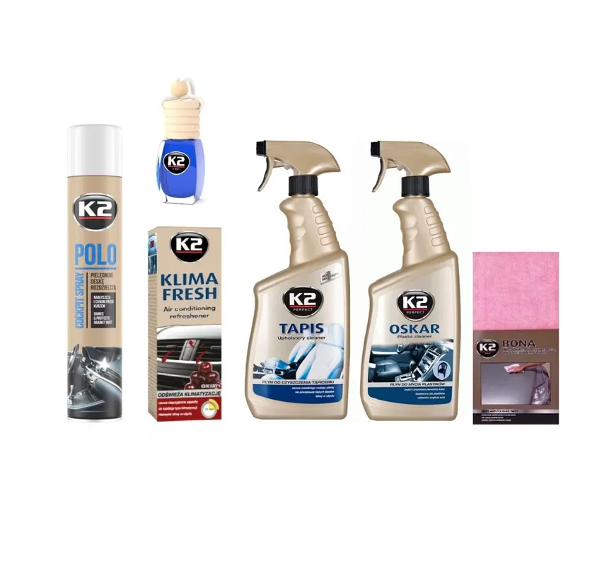W zestawie: – K2 OSKAR PŁYN DO CZYSZCZENIA PLASTIKÓW 770ML – K2 TAPIS PŁYN DO CZYSZCZENIA TAPICERKI 770ML – K2 BONA MIKROFIBRA RÓŻOWA 40X40 – K2 POLO COCKPIT 750ML – K2 KLIMA FRESH ODGRZYBIACZ 150ML – K2 VENTO ZAPACH SAMOCHODOWY 8ML Prosimy podać wybrane zapachy wuwagach do zamówienia, wprzypadku braku informacji, zapachy wysyłane losowo. K2 OSKAR PŁYN DO CZYSZCZENIA PLASTIKÓW 770ML Doskonale usuwa trudne zabrudzenia zwszelkich części plastikowych, linoleum, skaju iinnych, zarówno wsamochodzie, jak iwdomu np. zmebli ogrodowych. OSKAR przywraca ich pierwotny kolor, by znów wyglądały jak nowe. Nowa receptura OSKARA została tak opracowana, aby przy zachowaniu swej bardzo wysokiej skuteczności zachować pH zbliżone do neutralnego. Jest on bezpieczniejszy dlaużytkownika wporównaniu do żrących wyrobów innych producentów opH ponad 12. Nowy atomizer pozwala na stosowanie OSKARA wkażdej pozycji, także do góry dnem, co dodatkowo ułatwia jego aplikację. K2 TAPIS PŁYN DO CZYSZCZENIA TAPICERKI 770ML Przenika wgłąb iusuwa brud nawet znajgłębszych warstw tkaniny. Przywraca czyszczonym powierzchniom ich naturalny kolor, by znowu wyglądały jak nowe. TAPIS ma postać pianki, dzięki czemu pozostaje wmiejscu użycia, co dodatkowo zwiększa jego możliwości czyszczące. Może być stosowany do profesjonalnego czyszczenia tapicerki, tworzyw sztucznych, dywanów, butów, powłok chromowanych, opon ifelg, zderzaków, deski rozdzielczej, tworzyw sztucznych iwielu innych. Przed użyciem wstrząsnąć. Sprawdzić działanie produktu wniewidocznym miejscu. Spryskać czyszczoną powierzchnię. Pozostawić na chwilę. Wytrzeć przy pomocy wilgotnej iczystej szmatki. K2 BONA MIKROFIBRA RÓŻOWA 40X40 Mikrowłókno do osuszania karoserii. Doskonałe właściwości suszące.Bezpieczeństwo dlalakieru.Niezwykła trwałość. Pozwala na bardzo szybkie osuszenie nawet kilku samochodów bez konieczności wykręcania. Nie powoduje zarysowań, niepozostawia żadnych smug. Mikrowłókno można wielokrotnie prać isuszyć. Wymiary 40×40 cm. K2 POLO COCKPIT 750ML K2 POLO COCKPIT to spray do pielęgnacji ikonserwacji deski rozdzielczej. Zawiera specjalne nanocząsteczki, dzięki którym włatwy iszybki sposób zabezpieczy cały kokpit, przywróci głęboką barwę orazwyrazistą fakturę czyszczonych elementów. Produkt wnika wczyszczony materiał, wydobywając intensywny kolor iblask deski rozdzielczej. Antystatyczna formuła utrudnia ponowne osadzanie kurzu orazchroni przed niekorzystnym działaniem promieni UV. Całkowicie bezpieczny dlaczyszczonych powierzchni. Zapobiega przedwczesnemu starzeniu się materiałów takich jak plastik, winyl, guma iinne tworzywa sztuczne. Dostępne zapachy: – FAHREN – FRESH – WANILIA K2 KLIMA FRESH ODGRZYBIACZ 150ML K2 KLIMA FRESH to niezwykle skuteczny iłatwy wużyciu środek do odświeżania klimatyzacji. Usuwa nieprzyjemne zapachy, które powstają na skutek zanieczyszczeń iwilgoci wukładzie wentylacyjnym. Cały proces niezabiera więcej niż kilkanaście minut. Nadaje się do każdego typu klimatyzacji. Dostępne zapachy: – LEMON – FLOWER – CHERRY K2 VENTO ZAPACH SAMOCHODOWY 8ML K2 VENTO to unikalny design, stopniowa aplikacja ipraktyczne mocowanie, dzięki któremu odświeżacz będzie zawsze wmiejscu, wktórym został zamontowany. Aplikator zaprojektowany został tak, aby zapach dozować stopniowo wminimalnych ilościach. Drewniany korek nasącza się substancją zapachową iwten sposób powoli ją uwalnia. Dostępne zapachy: – COLA – OCEAN – ZIELONA HERBATA – ZIELONE JABŁKO – CYTRYNA – FRESH – TRUSKAWKA