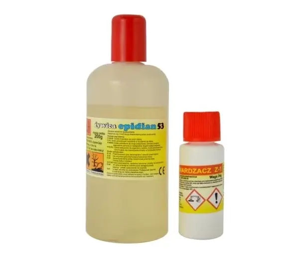 Żywica Epidian 53 200g + Utwardzacz Z1 24g Jest to modyfikowana styrenem, bezbarwna żywica epoksydowa, stosowana do:klejenia drewna, metali iszkła, kamionki, tworzyw sztucznych,tworzenia laminatów epoksydowo – szklanych czyimpregnacji różnego rodzaju materiałów. Żywica ma postać lepkiej cieczy ożółtym zabarwieniu onastępujących właściwościach: możliwość utwardzania wtemp. pokojowej, doskonała przyczepność do wielu materiałów, dobre właściwości mechaniczne orazwysoka odporność na ścieranie iuszkodzenia, wysoka przesączalność mat itkanin Utwardzenie żywicy następuje po dodaniu utwardzacza wproporcji 1 do 10 (na 10 porcji żywicy przypada 1 porcja utwardzacza). Wstępne utwardzenie uzyskuje się po ok. 6-7 godzinach. Całkowite utwardzenie następuje po 7-14 dniach.
